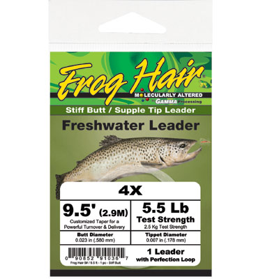 Das 2,90m lange Vorfach fischt ideal an Flüssen und Seen, das kürzere (7,5', also 2,30m) ist perfekt an kleinen Flüssen und Bächen. Tip: Um variabel zu sein, kann man ein 7,5 Fuß-Vorfach mit einem stärkeren Enddurchmesser wählen (z.B. 0,22mm) und das Ende mit einem Pitzenbauer-Ring versehen. So können Sie Länge, Stärke und Beschaffenheit der Vorfachspitze (z.B. FROG HAIR Fluocarbon!) individuell der jeweiligen Situation anpassen!