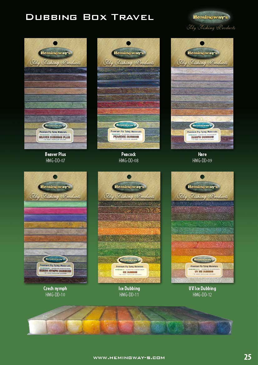 Hemingways Peacock Dubbing ist eines der effektivsten Pfauen-Blends in der Welt des Fliegenbindens heutzutage. Es ist ein großartiger Ersatz für natürliches Material und sehr gefragt bei Fliegenbindern die das gewisse Etwas suchen. Was dieses Material so besonders ist zum einen sie Lichtdurchlässigkeit, zum anderen der 3D-Effekt. Peacock Dubbing ist sehr gefragt aufgrund seiner Widerstandsfähigkeit sowie Vielseitigkeit, und mit ihm lässt sich jede bindetechnische Herausforderung meistern, seien es klassische Muster bis hin zu den modernsten Fliegenmustern des 20. Jahrhunderts.