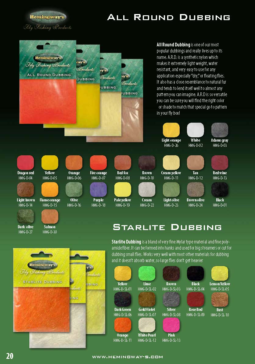 Starlite Dubbing ist eine Mischung aus sehr feinem Mylar-Material und feinen Polyamid-Fasern. Es kann für das Binden von Großstreamern verwendet werden oder genauso gut klein geschnitten als Dubbing für kleine Fliegen verwendet werden. Es harmoniert sehr gut mit anderen Dubbing-Materialien und es saugt kein Wasser auf, sodass große Fliegen nicht noch schwerer werden.