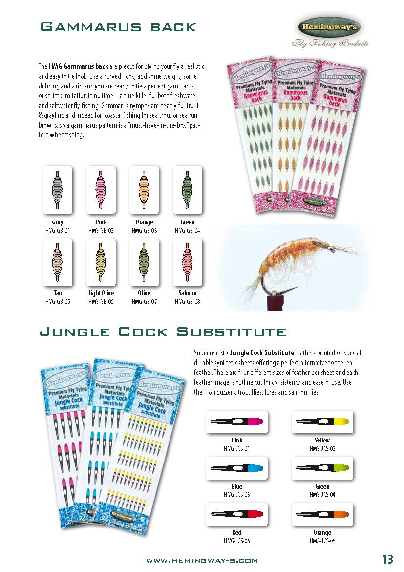 Superrealistische Jungle Cock Substitute-Federn gedruckt auf spezielle widerstandsfähige synthetische Blätter. Sie bieten eine perfekte Alternative zu den echten Federn des Jungle Cock. Pro Blatt sind 4 verschiedene Größen vorhanden und jedes einzelne Federblatt ist vorgeschnitten. Somit wird die Gleichheit der Federn gewährleistet und der Gebrauch erleichtert. Verwenden Sie sie für Forellenfliegen, Lachsfliegen oder Fisch-Imitaten.