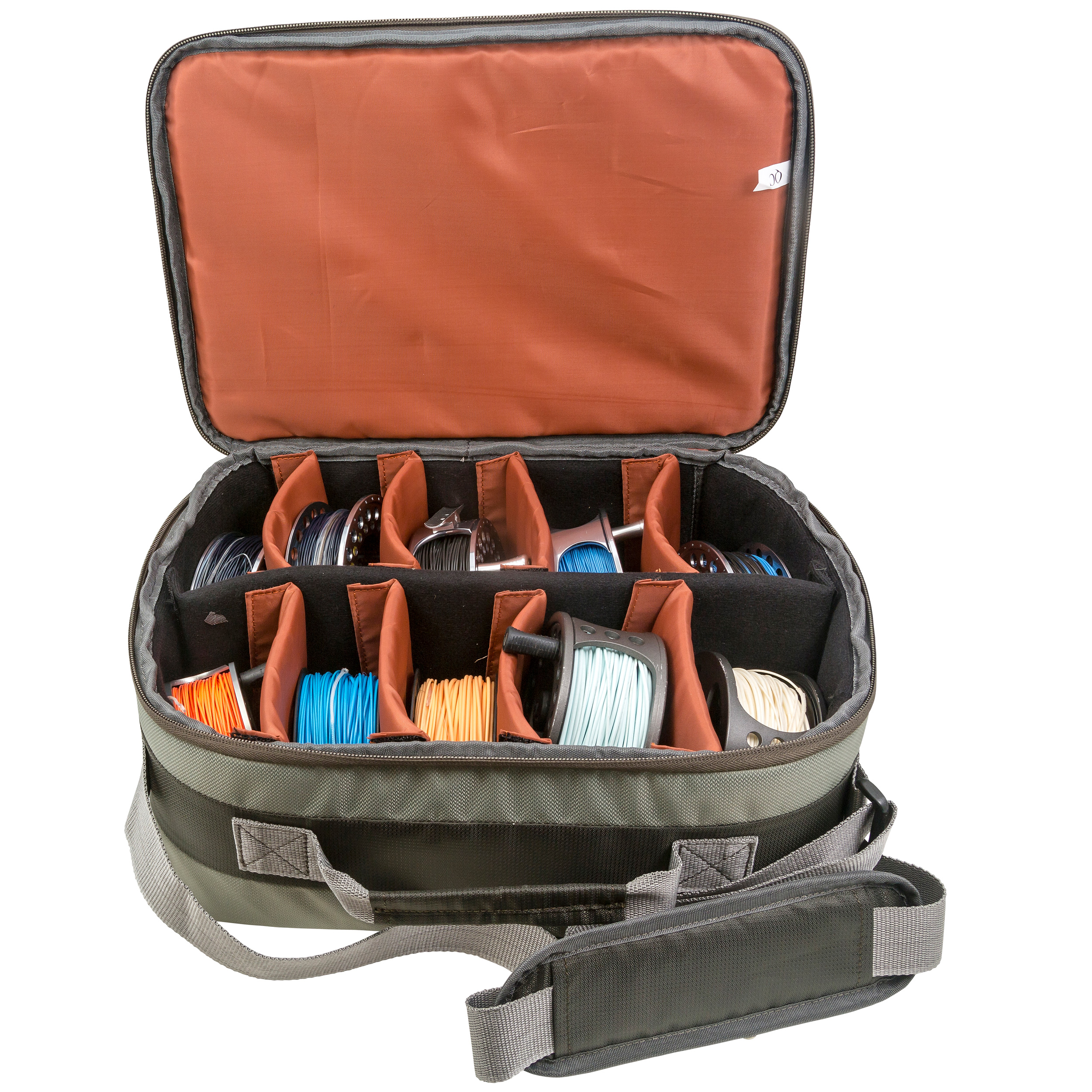 - Flexibilität: Die Innenseite der Tasche ist mit einem klettbaren Futter ausgekleidet, das die flexible Anordnung der Innenfächer ermöglicht. Die Tasche enthält 8 bewegliche Trennwände, die Platz für bis zu 10 große Fliegenrollen, einschließlich Lachs- und Salzwasserrollen, sowie Ersatzspulen und Zubehör bieten.