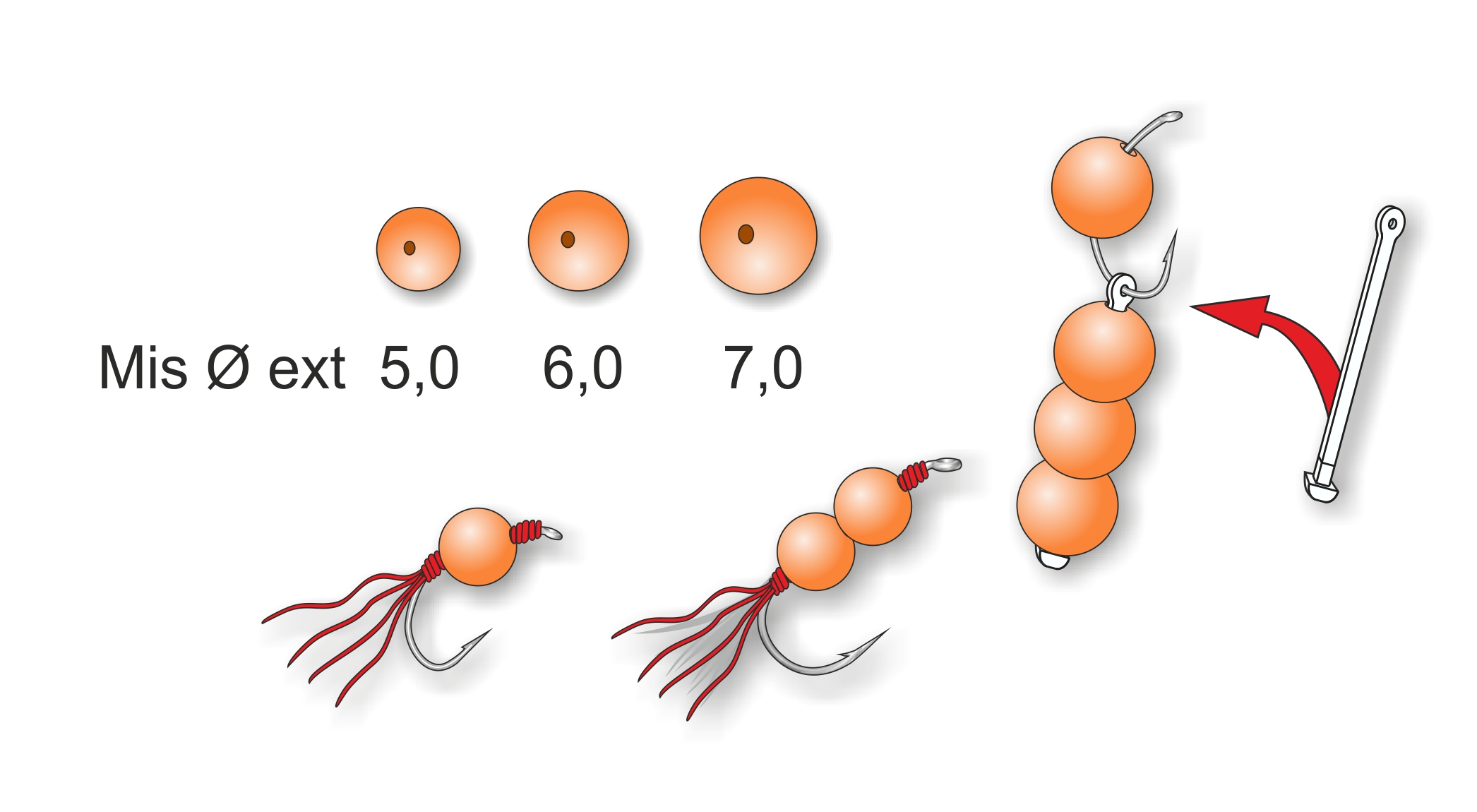 Weiche, leicht transparente Perlen zur naturgetreuen Nachbildung von Forellen- und Lachseiern. Ideal für verschiedene Fliegen- und Nymphenmuster oder zum gezielten Fischen auf laichfressende Fische.