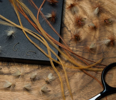 Die verwendeten Federn stammen aus dem Hals- und Umhangbereich genetisch selektierter Metz-Hähne, deren Zuchtlinien auf Jahrzehnte kontinuierlicher Optimierung zurückblicken. Das Ergebnis: dicht gefiederte, steife Hecheln mit feiner Struktur, ideal für schwimmfähige Trockenfliegen.