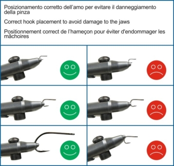 - Klemmbacken: Gehärtet, geeignet für Haken in Größen 28 bis 6/0