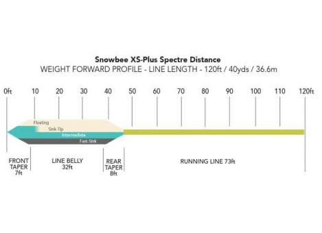 Die hintere Verjüngung beginnt bei 39 ft., fast 1/3 länger als bei der Standard XS, was den Lastpunkt verlängert, aber dennoch sehr handlich bleibt. Dies erleichtert das Werfen erheblich, ohne dass die Fliegenschnur zu dick wird, um dasselbe zu erreichen. Die Schnüre von Snowbee sind bekannt für ihre Schlankheit, und durch die Verlängerung des Kopfes wird eine perfekte Rutenflexion ermöglicht, ohne den Windwiderstand zu erhöhen.